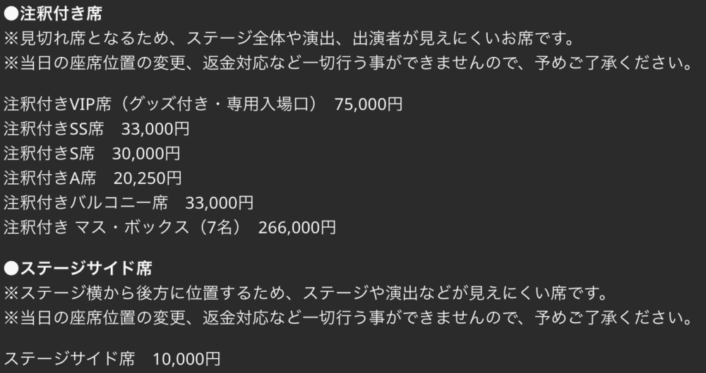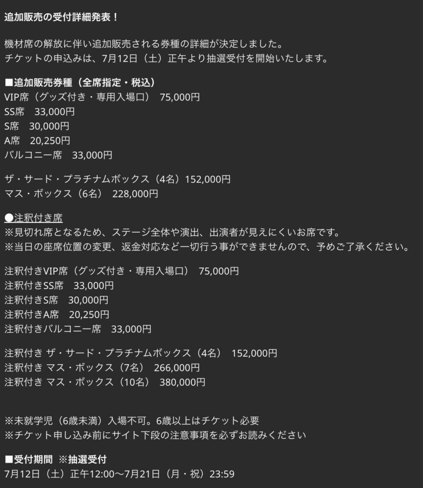 また、追加販売では機材席の解放につき、注釈付き席とステージサイド席も登場した。