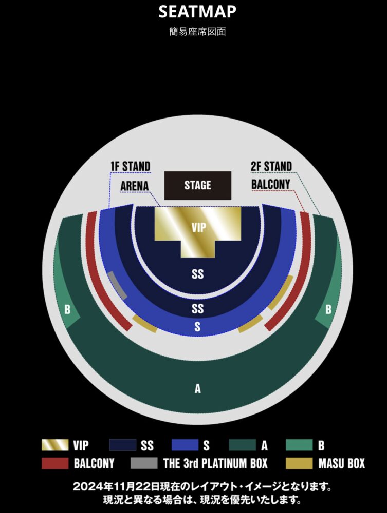 SS席はVIP席より後ろのアリーナと1Fスタンドの前方、S席は1Fスタンド後方、A席B席は2Fスタンドになる。