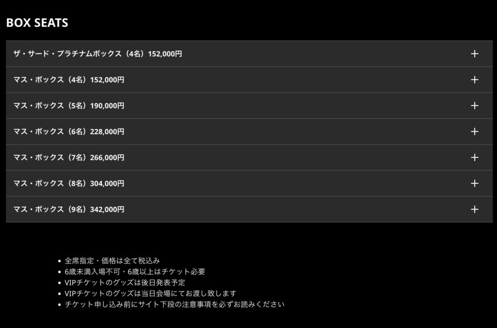 と、記事投稿後に気づいたのだが、上記のボックス席はスカイテラスという席で今回ボックス席の券種にあるのはマス・ボックス席じゃないかと。